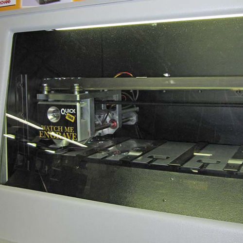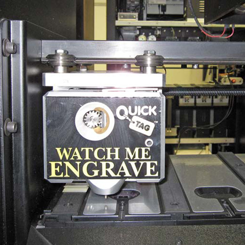 最先进的QuickTag™主要用于宠物商店,它是一台计算机驱动的独立机器,可以在不到两分钟的时间内雕刻出个人身份和宠物id标签。客户首先从雕刻机上方的视频触摸屏上选择标签样式和文本,然后通过观察窗口观看制作过程。根据空白金属标签的大小和形状,将其分配到指定的槽中。雕刻头会自动定位在标签上方,并将触摸屏输入的信息雕刻出来。